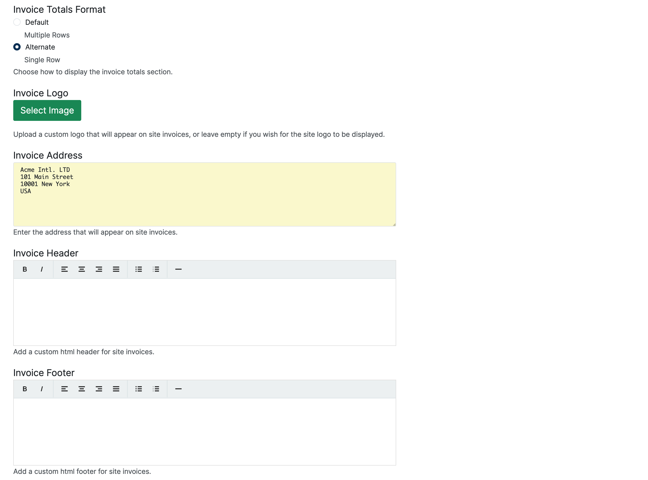 From the Site Invoice Settings (Admin Control Panel -> Settings -> Site Settings -> Site Invoice Settings) menu set/add: