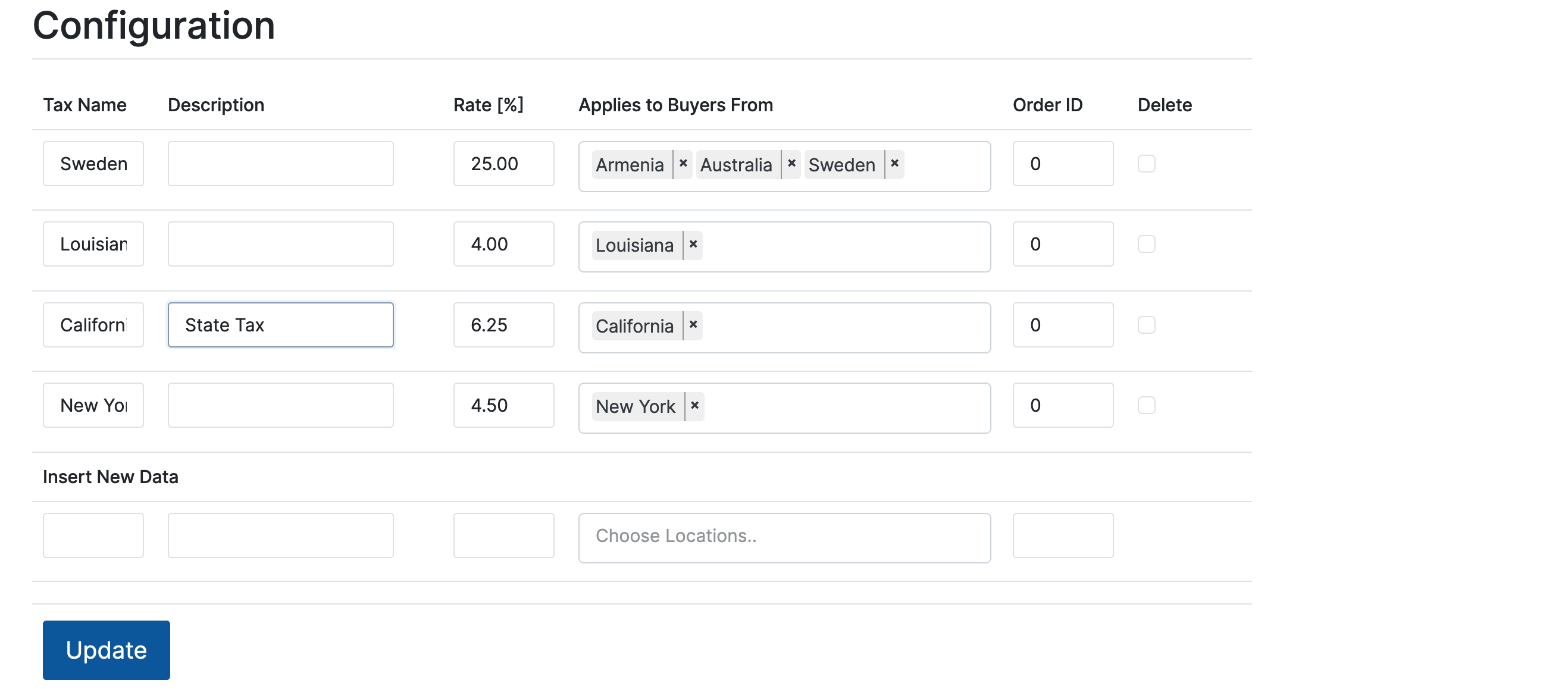 Example: The admin added a 6.25% State Tax for all buyers from California.