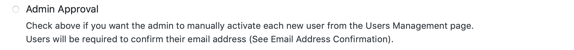 If checked, admins will have to manually activate new accounts from the Users management page, (Admin Control Panel -> Users -> Site Users) then follow the steps described in the Email Address Verification.