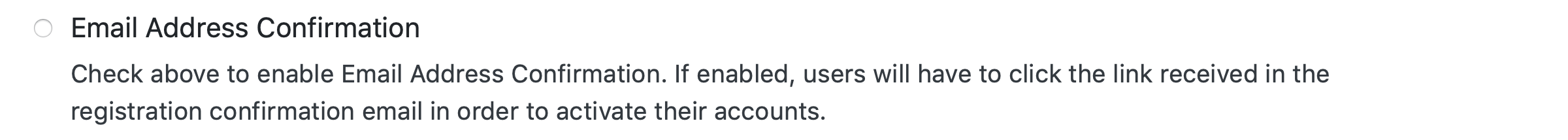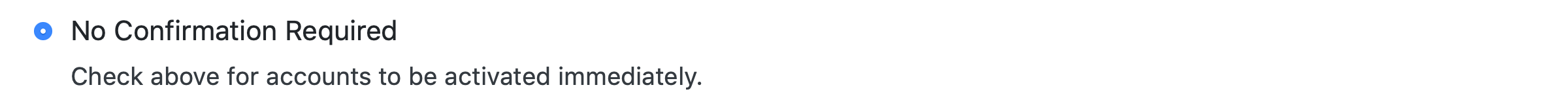Admins select the confirmation method for new accounts. No Confirmation Required speeds up the registration process by removing the user validation step. Otherwise, Email Address Verification and Admin Approval, add important security layers by requiring email address validation.